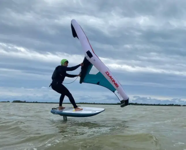 Wingfoiling is newer to the scene. You ride a foil board while holding an inflatable wing in your hands. Once you lift onto the foil, friction disappears — and suddenly you’re floating above the water.