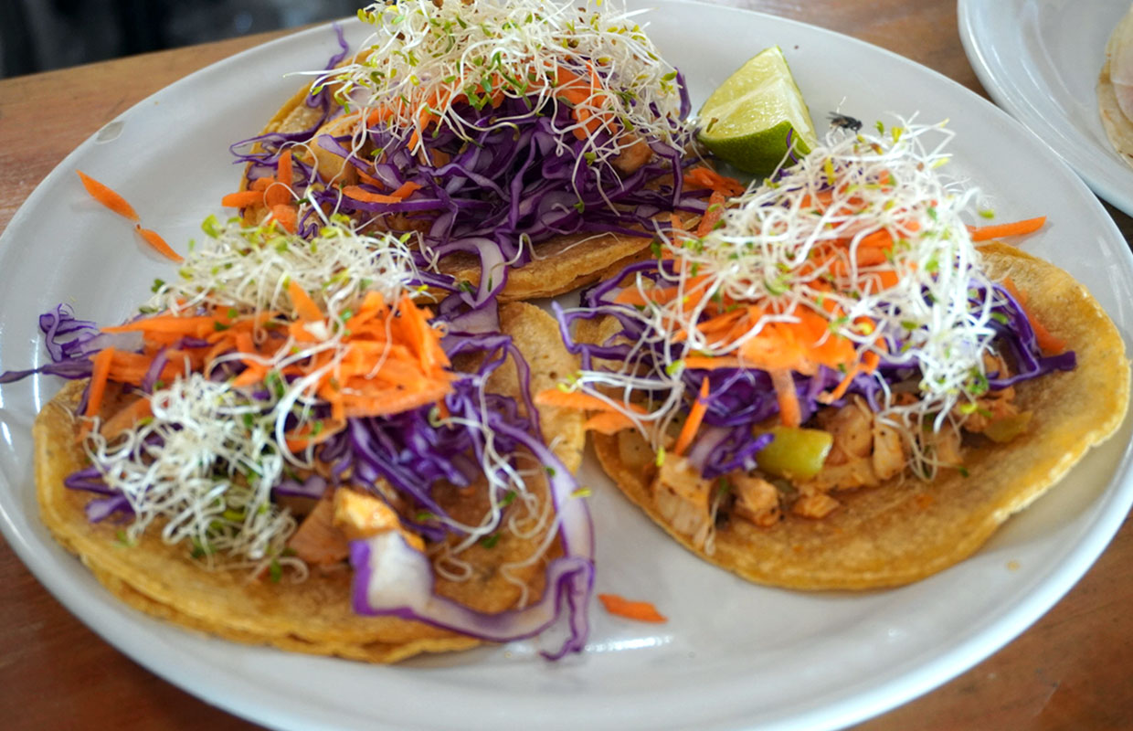 Chicken Tacos (chicken marinated in sour orange juice, oregano and chayote with purple cabbage salad, carrot and sprouts) 1-$65 / 3-$ 170